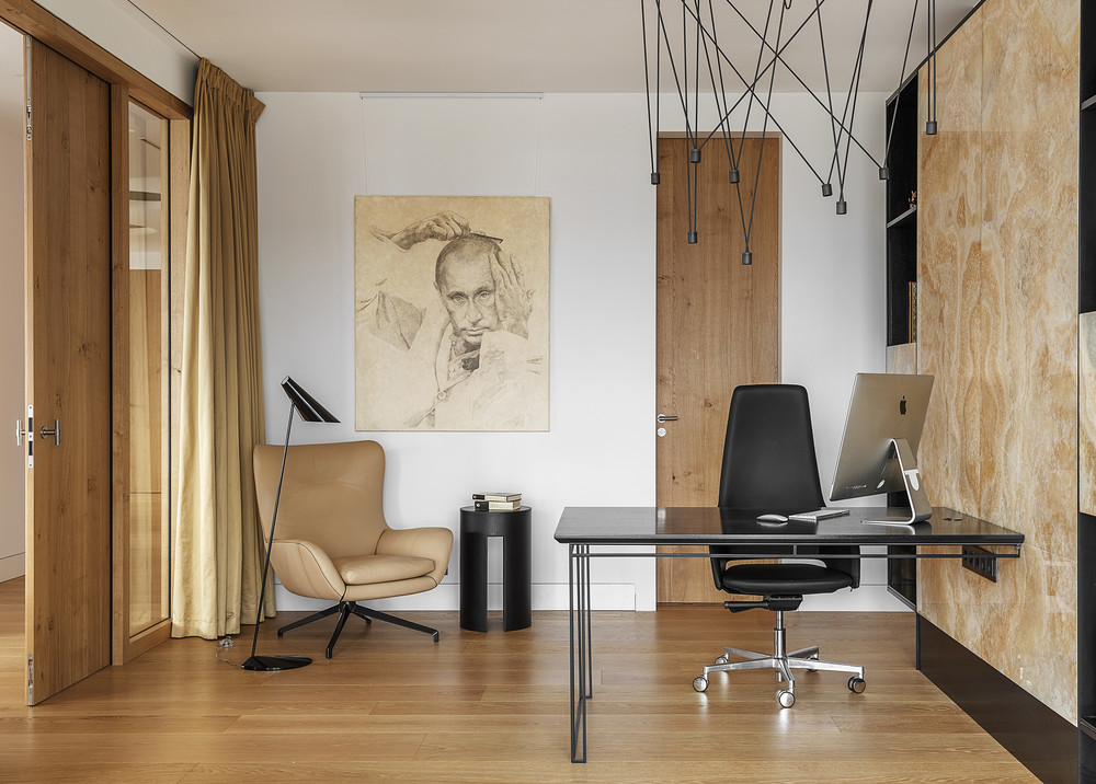 Современный интерьер этих апартаментов (400м2) обладает динамичным характером: ритмы округлых и прямоугольных форм заряжают пространство энергией, а мягкие природные цвета и материалы создают домашний уют
