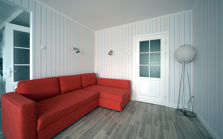 Гостиная в новостройке оформлена предельно лаконично. Паркетная доска, светлые обои на стенах и минимум мебели. Для ярко-красного дивана потребовался неяркий, но и не скучный фон. Такую роль отлично сыграла тонкая бело-голубая полоска.